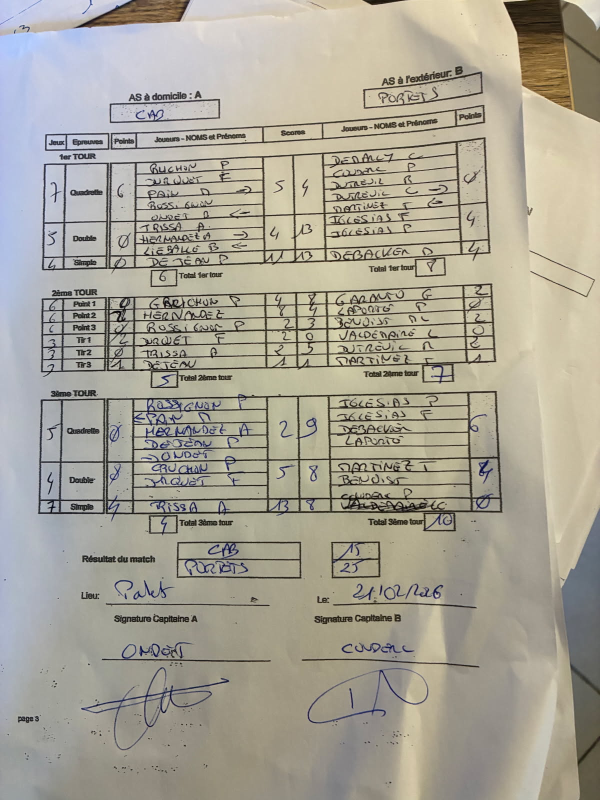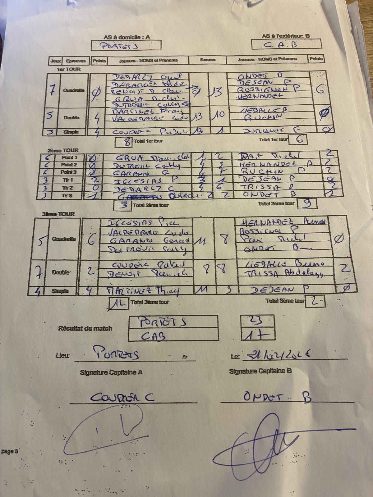 *Compensant rapidement un départ un brin timide à potron-minet (à ne pas confondre avec un minet poltron), menés 11 à 15 après 2 tours, nos joueurs ont passé la surmultiplié sur le 3ème tour pour s'imposer en fin de matinée et ainsi remporter le match aller face à l'armada béglaise sur le score de 23 à 17. Feuille de match