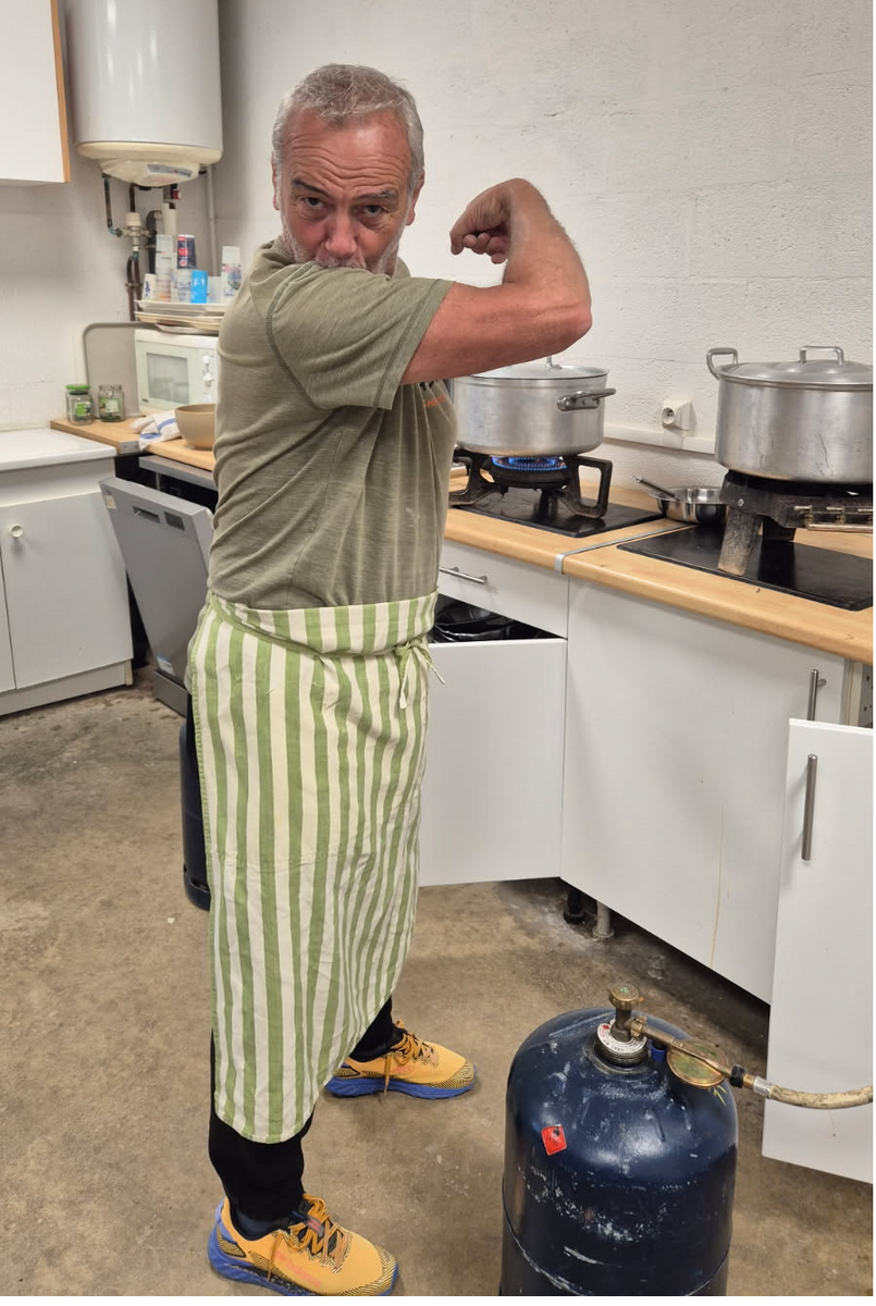 Samedi, notre meilleur cuisto (il s'adore. Voir photo) s'est accaparé les fourneaux pour préparer son savoureux "saucisse lentilles". Des lentilles cuites dans jus savamment dosé accompagnées d'une excellente saucisse cuite au four ont ravi les papilles des 75 convives. Les commis de cuisine se sont appliqués pour proposer une entrée variée (avec des carottes râpées maison que seul Dracula aurait boudées), un fromage bien coulant et une belle part de flan. PARFAIT !!